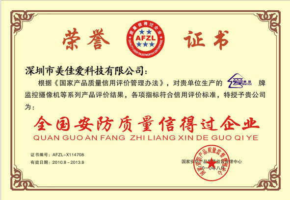 全國(guó)安防質(zhì)量信得過企業(yè)證書副本